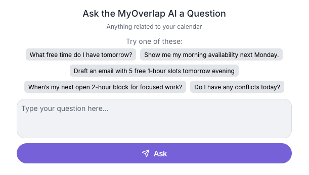 No more hunting for open slots or toggling between week and day views. Simply ask MyOverlap AI questions like:
