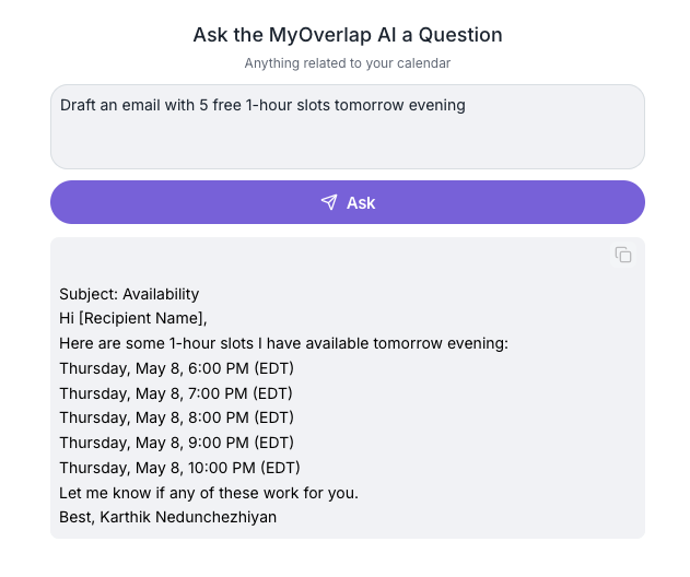 MyOverlap AI doesn’t just report availability—it helps you find the best times.