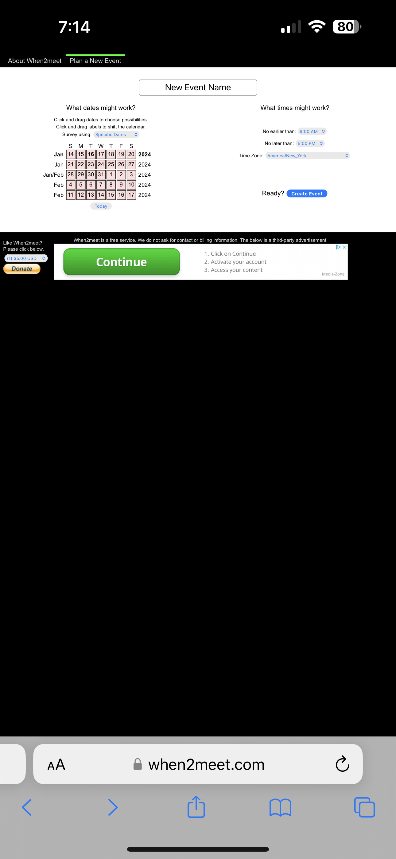 When2Meet’s no-registration policy is a double-edged sword. It lowers barriers for new users but lacks the continuity and personalization that comes with having an account. This absence of user accounts undermines the ability to provide a customized and consistent experience for returning users.