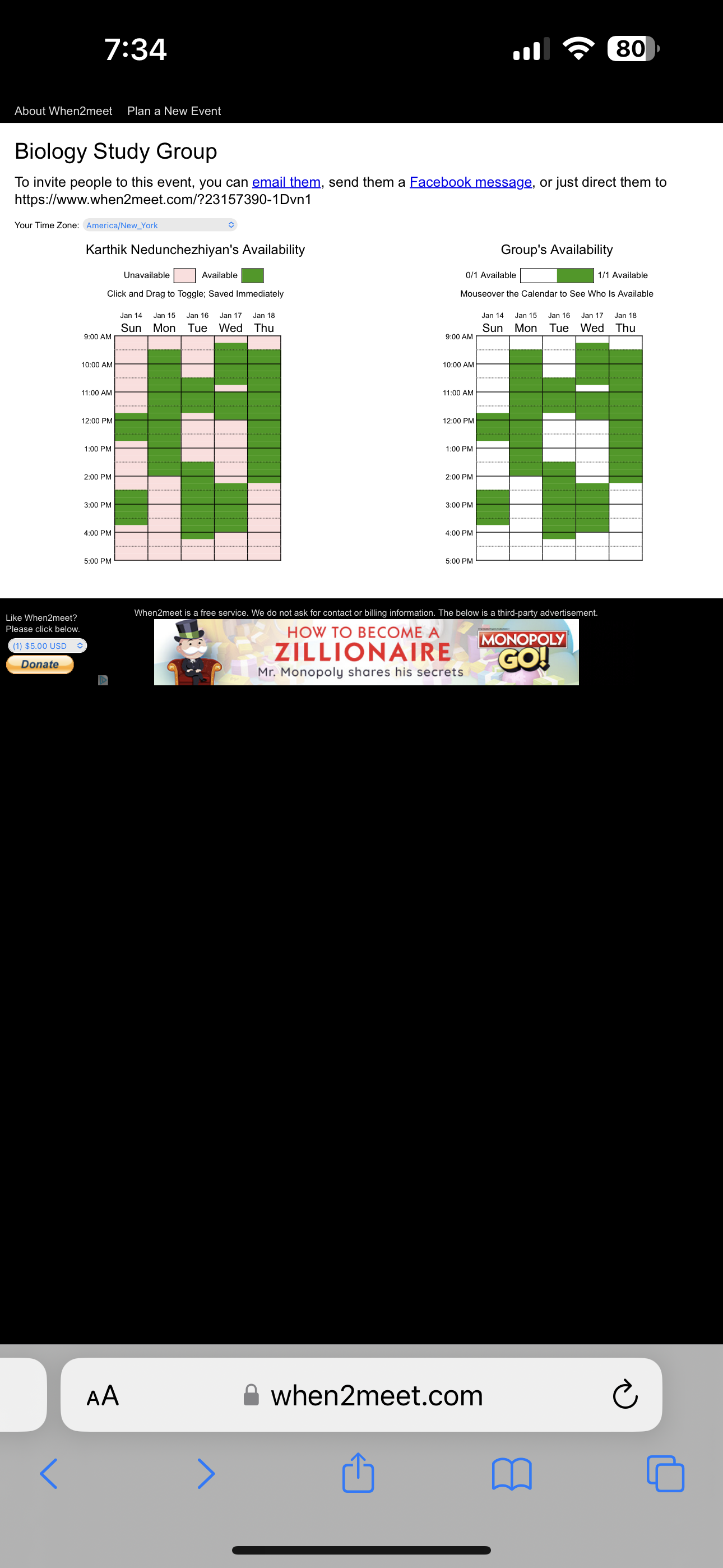 The user interface of When2Meet, while featuring an easy-to-use drag mechanism for scheduling available hours, presents a significant problem due to its cluttered design. This clutter often leads to confusion among users, who frequently click on the right-hand map by mistake, thinking it's the same as the left-hand map used for entering hours. Although this issue only causes a brief delay of a few seconds, it's a recurring inconvenience that can frustrate users